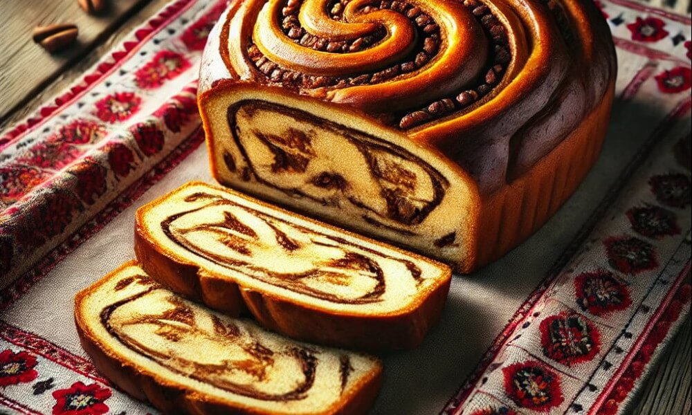 El cozonac es un dulce típico de Rumania, muy tradicional en celebraciones como la Navidad y la Pascua. Se trata de un pan suave y dulce, preparado con leche, huevos, azúcar y mantequilla, que le dan una textura esponjosa y rica. Su característica principal es el relleno, que generalmente está hecho de nueces molidas mezcladas con cacao y azúcar, y a veces incluye pasas o frutas confitadas para darle un toque extra.